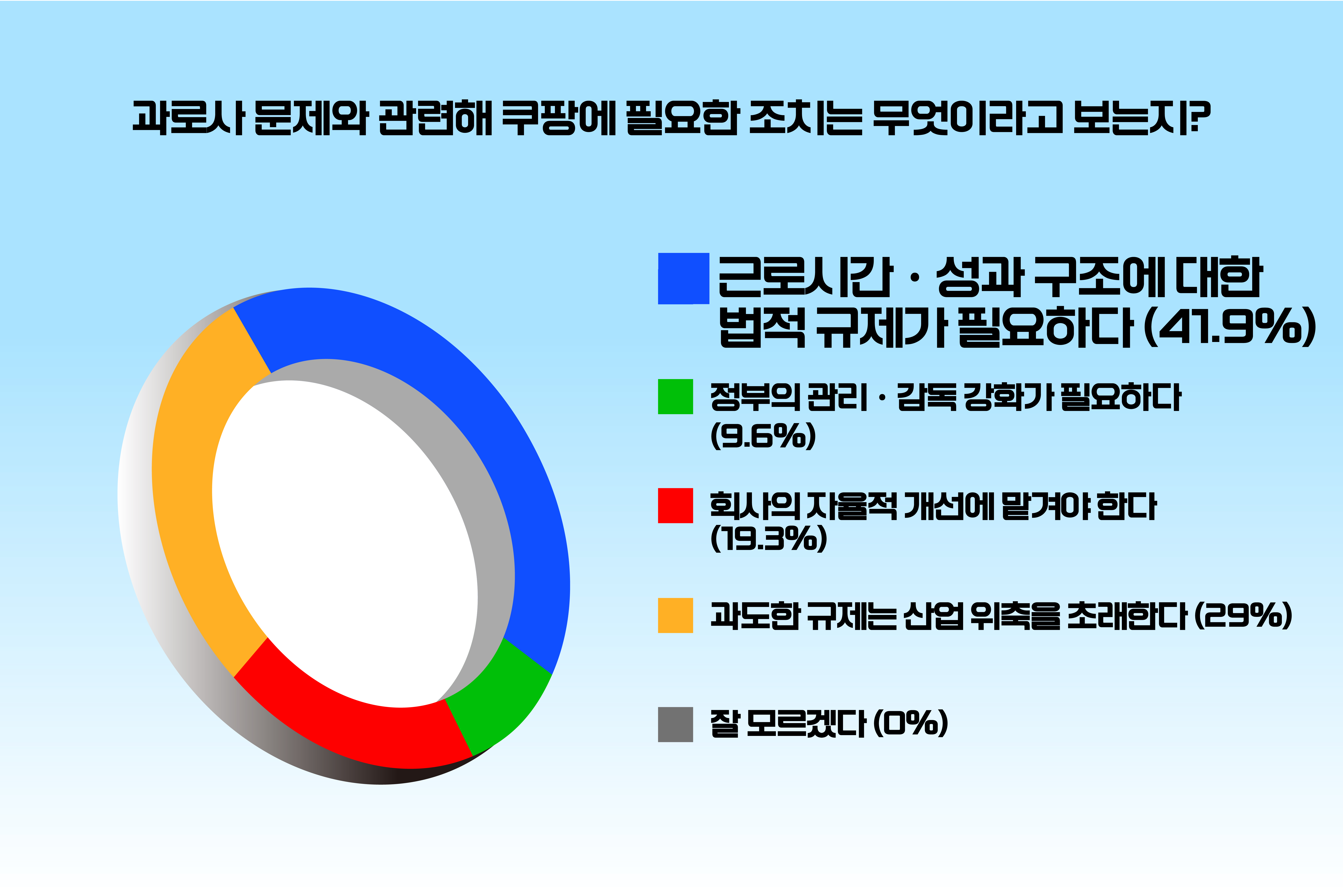 그러면서 과로사 문제에 대한 쿠팡에 부과해야 될 조치로 '근로시간·성과 구조에 대한 법적 규제 필요하다'는 비율이 41.9%로 가장 높았다.