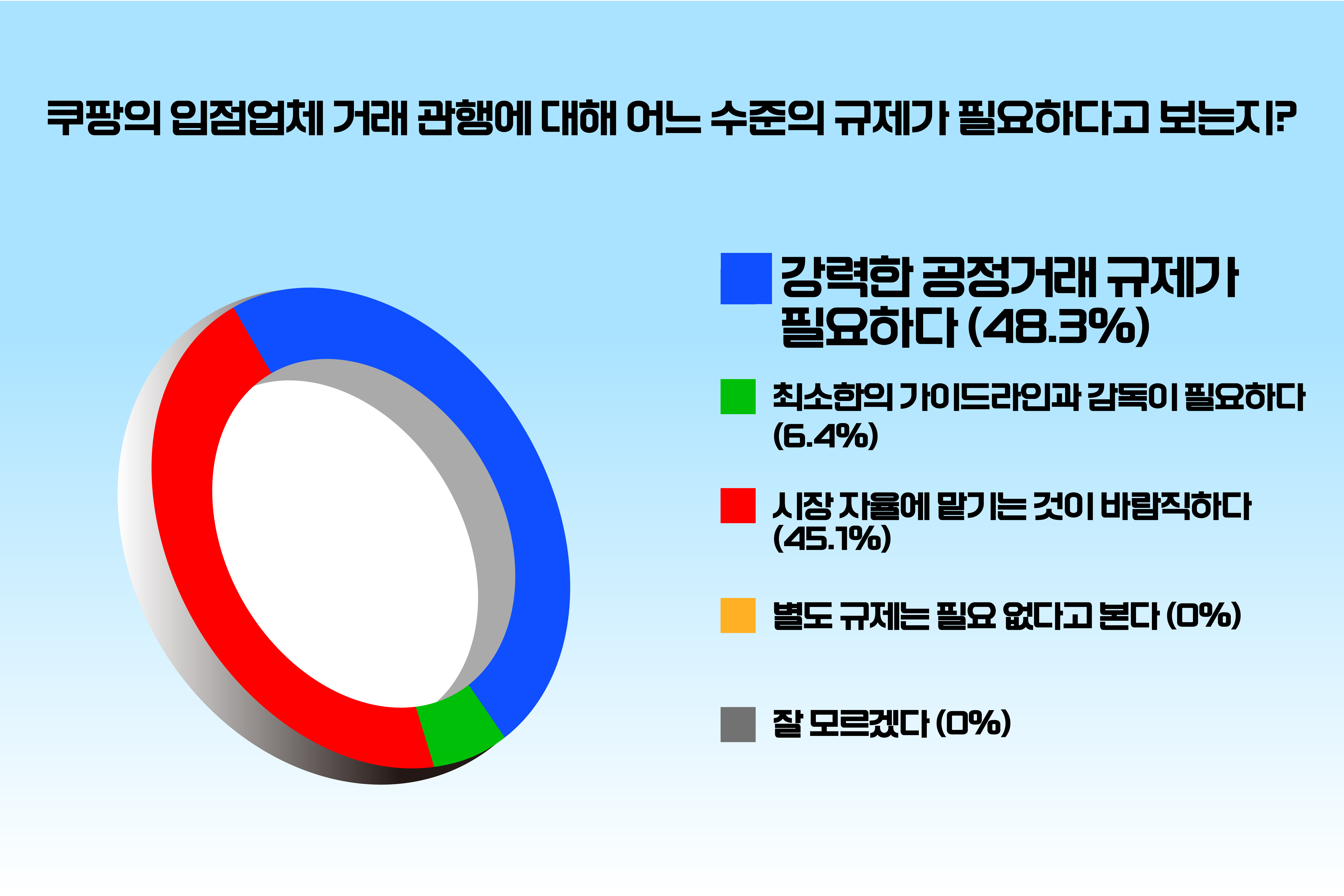 쿠팡과 입점업체 간 불공정 거래 논란에 대한 입장을 묻는 질문에 '대형 플랫폼의 구조적 갑질 문제'라고 답한 비율이 48.3%로 가장 높은 비율을 차지했다.