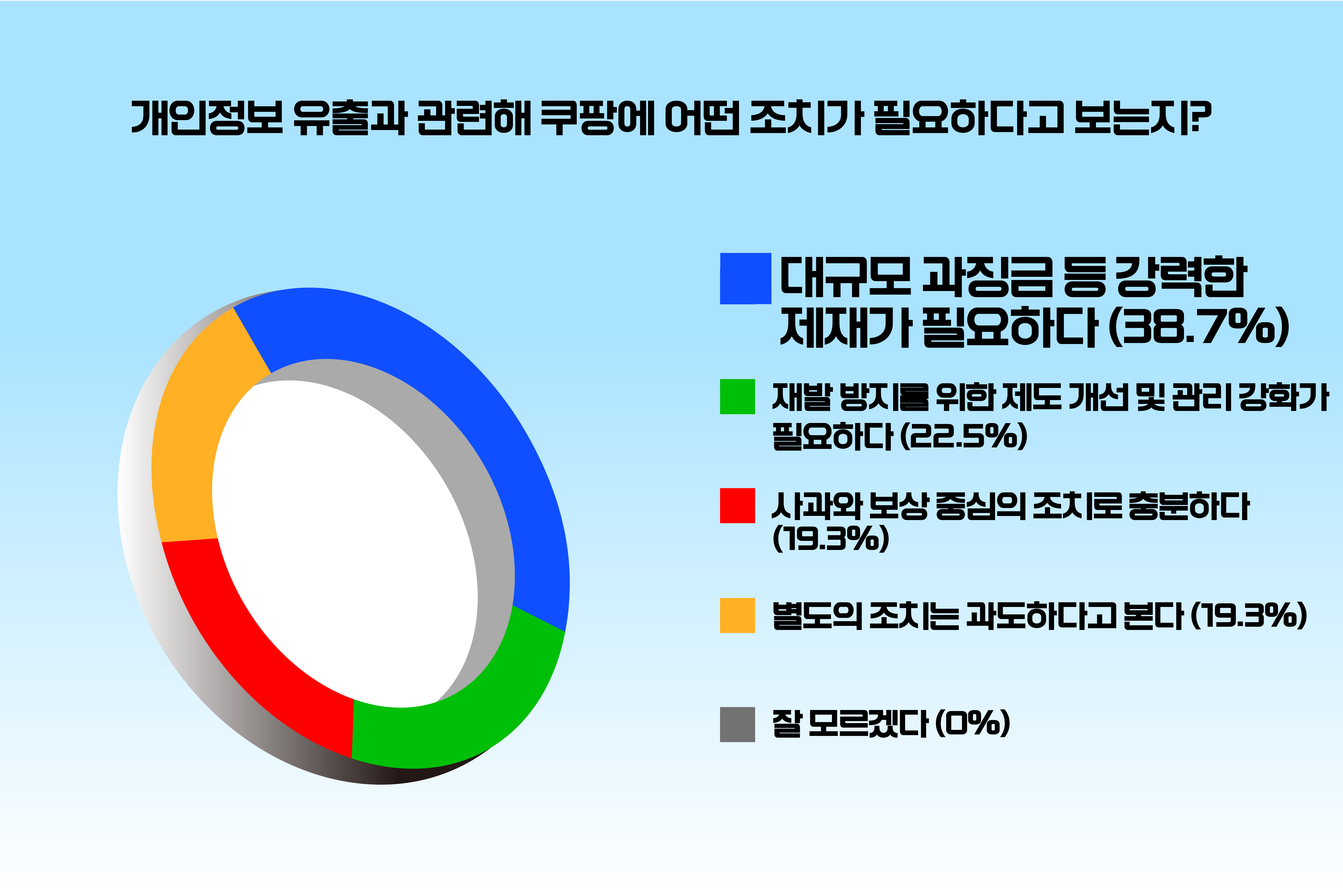 특히 이번 사태에 대해 향후 쿠팡에 대한 조치로는 대규모 과징금 부과 등을 통해 강력한 제제의 필요성에 공감하는 비율(38.7%)이 높게 조사됐다.