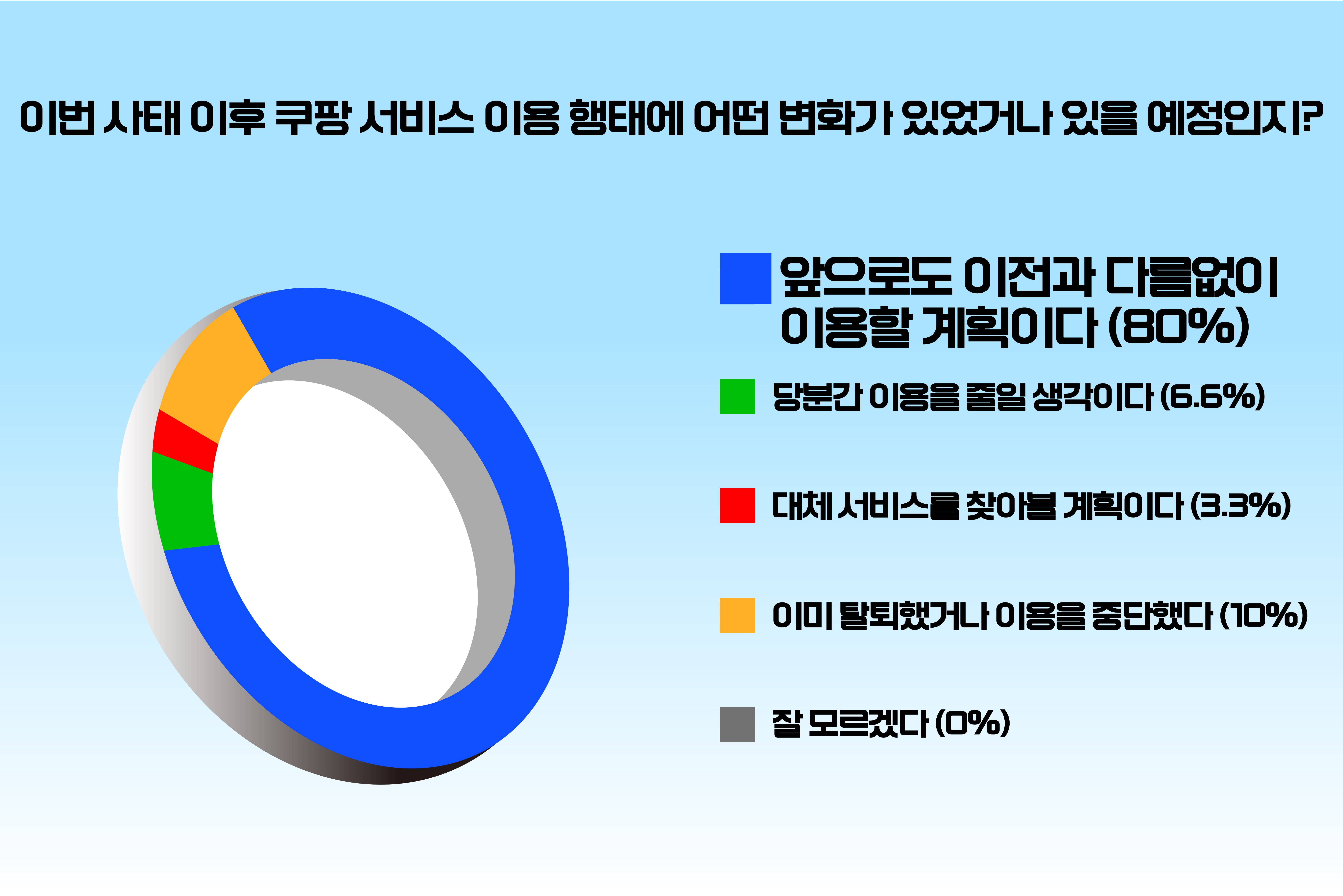 이번 사태 이후 쿠팡 서비스 이용 행태에 변화가 있을 것인지를 묻자 '앞으로도 이전과 다름없이 이용할 계획이다'가 80%로 압도적으로 높은 수치를 보였다.