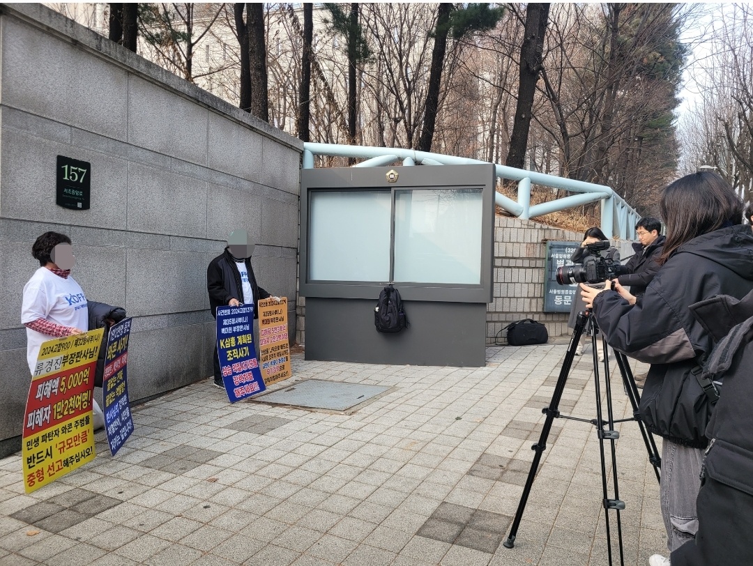 한국사기예방국민회 회원들이 서울 서초동 법원 앞에서 진행된 ytn '팩트추적' 제작진과 인터뷰 및 촬영에 임하고 있다. 사진=한국사기예방국민회