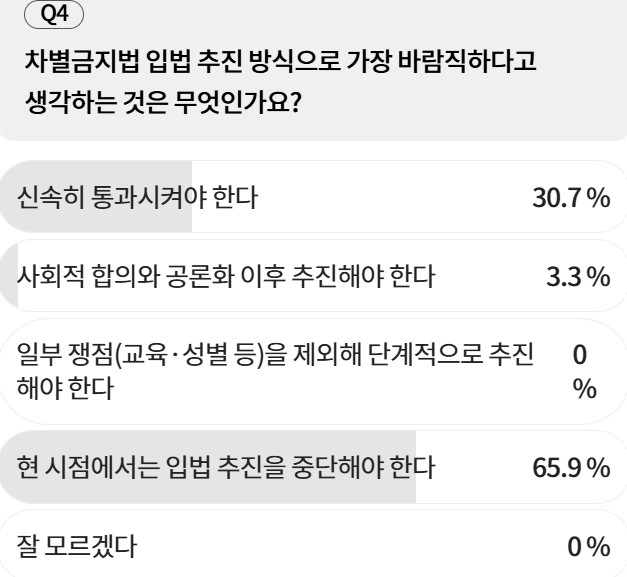 입법 추진 방식에 대한 질문에서는 ‘현 시점에서는 입법 추진을 중단해야 한다’가 65.9%로 가장 많았다. ‘신속히 통과시켜야 한다’는 30.7%였다. ‘사회적 합의와 공론화 이후 추진’은 3.3%에 그쳤다. ‘일부 쟁점(교육·성별 등)을 제외해 단계적으로 추진’은 0%였다. ‘중단’과 ‘신속 통과’가 양극에 서고, 중간 해법이 힘을 받지 못하는 구조가 확인됐다.