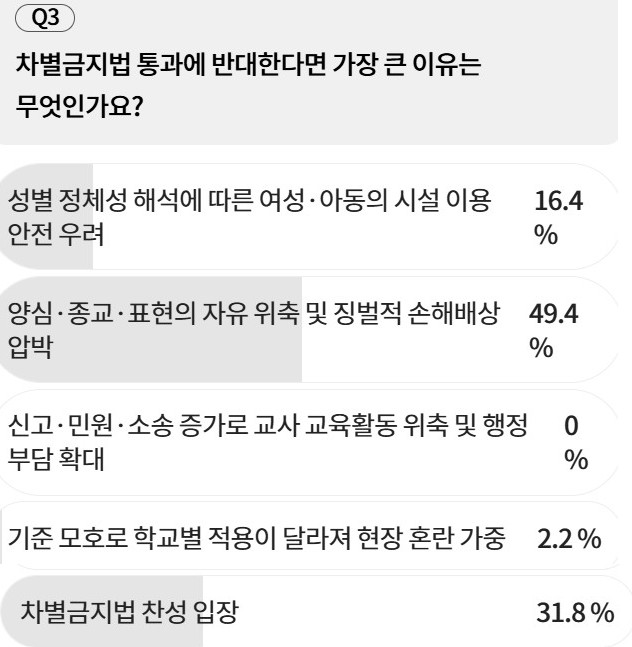 ‘차별금지법 통과에 반대한다면 가장 큰 이유’를 묻는 질문에서는 ‘양심·종교·표현의 자유 위축 및 징벌적 손해배상 압박’이 49.4%로 가장 높았다. ‘성별 정체성 해석에 따른 여성·아동의 시설 이용 안전 우려’는 16.4%였다. ‘기준 모호로 학교별 적용이 달라져 현장 혼란 가중’은 2.2%였다. ‘신고·민원·소송 증가로 교사 교육활동 위축 및 행정 부담 확대’는 0%로 집계됐다.