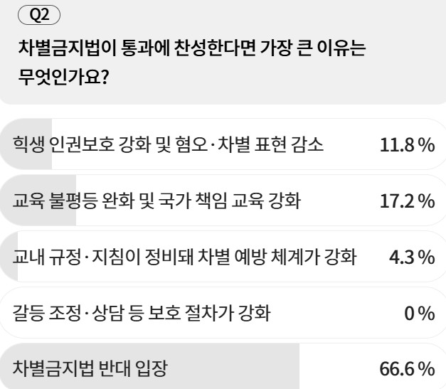 ‘차별금지법 통과에 찬성한다면 가장 큰 이유’를 묻는 질문에서는 ‘교육 불평등 완화 및 국가 책임 교육 강화’가 17.2%로 가장 높았다. ‘희생 인권보호 강화 및 혐오·차별 표현 감소’는 11.8%였다. ‘교내 규정·지침 정비로 차별 예방 체계 강화’는 4.3%였고, ‘갈등 조정·상담 등 보호 절차 강화’는 0%였다.