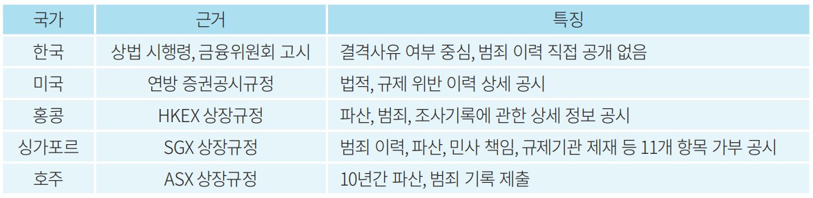 이 같은 차이는 단순한 제도 비교를 넘어, 기업지배구조의 질과 투자자 신뢰에도 영향을 미칠 수 있는 부분이다. 이사의 자격을 어디까지 검증할 것인지에 대한 기준이 국가마다 다를 경우, 시장 참여자 입장에서는 동일한 정보로도 다른 수준의 위험을 감수해야 하기 때문이다.