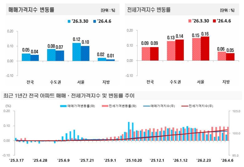 [위즈경제] 조중환 기자 = 한국부동산원이 9일 발표한 ‘2026년 4월 1주(4월 6일 기준) 전국주택가격동향조사’에 따르면 이번 주 전국 아파트 시장은 매매와 전세가 모두 올랐다. 다만 숫자만 놓고 시장 전반의 회복으로 단정하기는 어렵다. 전국 아파트 매매가격은 0.04%, 전세가격은 0.09% 상승해 전세가 매매보다 더 빠르게 움직였고, 상승의 범위도 일부 지역에 집중되는 양상이 더 뚜렷해졌다.