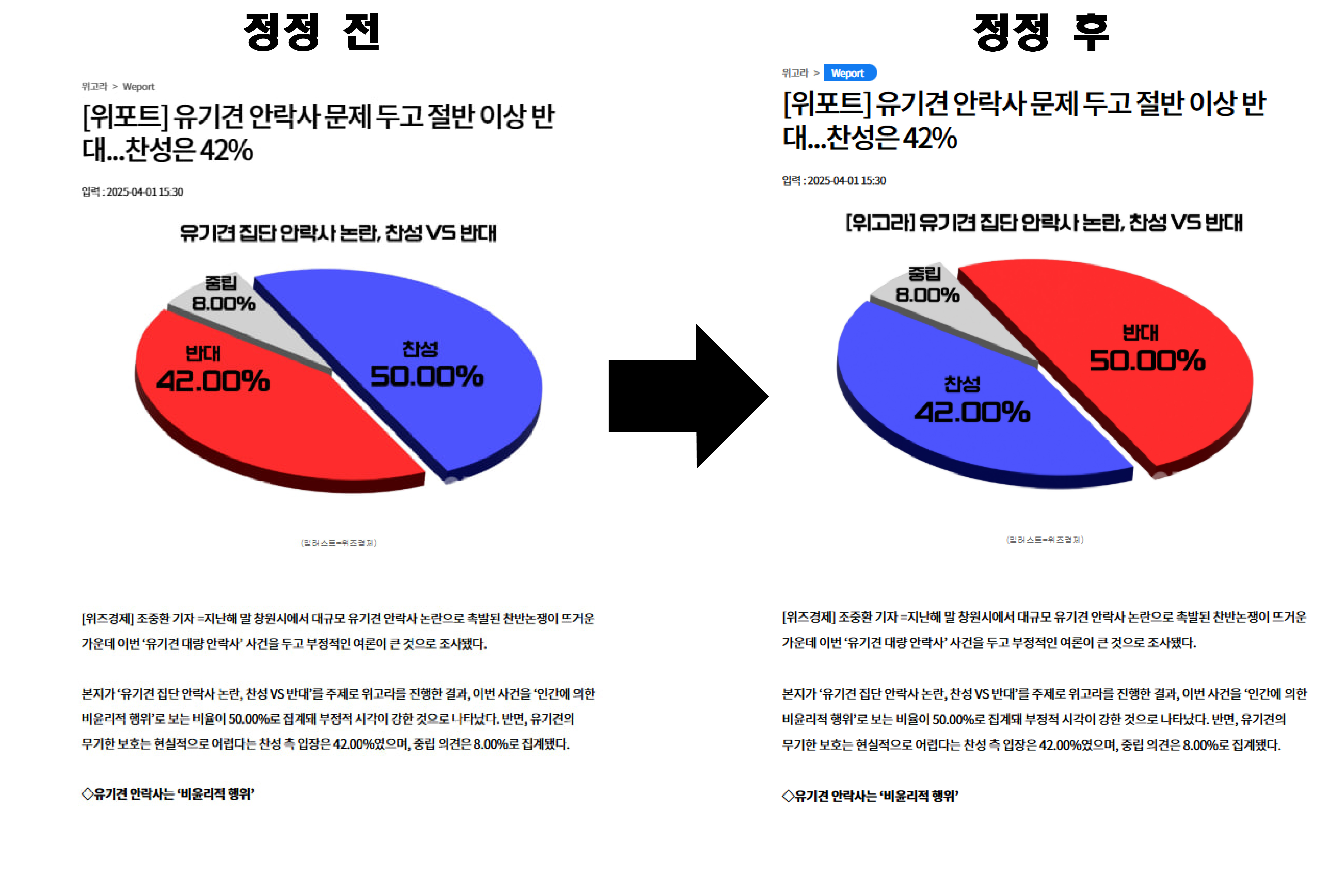 [위즈경제] 이정원 기자 =위즈경제는 2025년 4월 1일 보도한 '[위포트] 유기견 안락사 문제 두고 절반 이상 반대...찬성은 42%' 기사에 포함된 그래프 내용 중 일부 오류가 확인되어 이를 바로잡습니다.