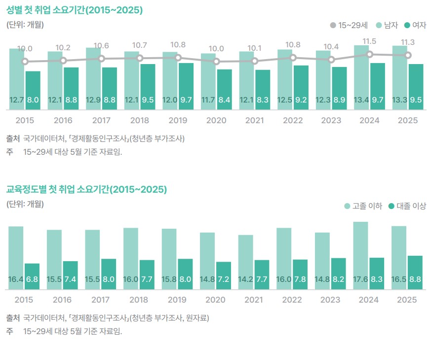 국가통계연구원이 펴낸 ‘청년 삶의 질 2025’ 보고서는 청년 고용시장의 구조적 문제를 보다 구체적으로 보여준다. 보고서에 따르면 15~29세 청년의 첫 취업 소요기간은 2025년 기준 11.3개월이었다. 전년보다 0.2개월 줄었지만 2015년의 10.0개월과 비교하면 오히려 늘었다. 학력에 따른 차이도 선명했다.