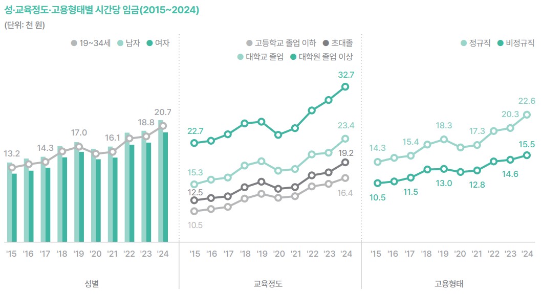 더 눈에 띄는 대목은 취업 이후다. 보고서에 따르면 2024년 19~34세 청년의 시간당 임금은 2만660원이었다. 겉으로는 2015년 1만3200원대에서 꾸준히 오른 흐름이지만, 내부 격차는 더 선명했다. 정규직은 2만2644원, 비정규직은 1만5459원으로 차이가 7185원 벌어졌다. 2015년 정규직과 비정규직의 시급 격차가 3773원이었던 점을 감안하면 차이는 오히려 더 커졌다.