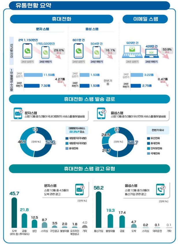 실제 이용자 1인당 월평균 스팸 수신량은 11.60통으로 전반기 16.34통 대비 4.74통 줄었으며, 스팸 신고·탐지 건수 역시 1억 5,952만 건으로 약 6,728만 건 감소했다.